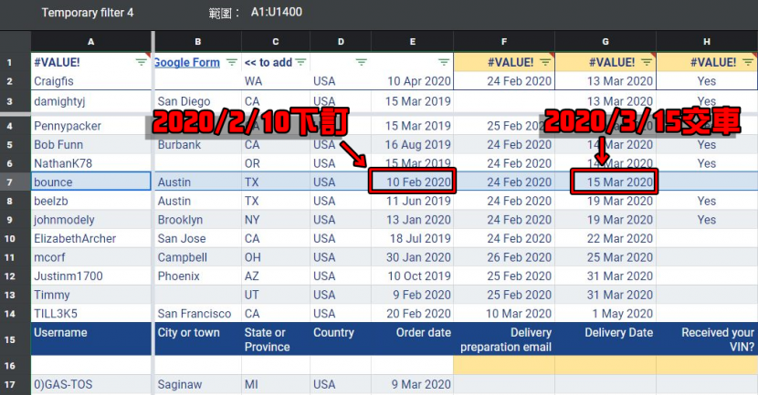 這幾天不斷有消息指 Model Y 會提前交車,今日有更明確的證據顯示特斯拉真的進度超前,因為多名車主就出示了領車通知,而日期都早於原定的 3/15,其中還有出現幾個下訂後隨即通知領車的怪異案例。 ▲ 數名美國車主分享了領車信函,交車日最早有來到 3/13,比原定的 3/15 要早了二天。 根據 TESLIKE 發布的 Model Y 車主追蹤紀錄,今天起陸續有車主填上確認後的交車日期,最早的紀錄就是 3/13,顯示這個周末包括華盛頓州、奧勒岡州與加州,都有車主會提前領 Model Y。 至於在追蹤車輛識別碼 (VIN) 的進度上,序號區間也從本來的 XXX400~XXX800 來到 XX1XXX 的千位數,但仍無法推斷究竟第一個周末會交出幾台車。 有趣的是,在目前少數已經回報領車日期的名單中,一位德州奧斯丁車主就特別福氣。他的領車日期也在首批的 3/15,但其實是今年二月份才訂購,從下單到領車只花了剛剛好一個月,讓許多早在一年前就下訂、此刻卻還等不到領車通知的車主羨慕到不行。 原來,不是只有台灣會有這種不顧先來後到的領車異象,即使是在特斯拉的大本營美國也是會發生,而且還是在無敵熱門的 Model Y 身上(若仔細看表格,會發現不少車主都是今年才訂車、但也都可以在這幾個月交車的) 其中的原因?恐怕真的只有特斯拉自己知道了。