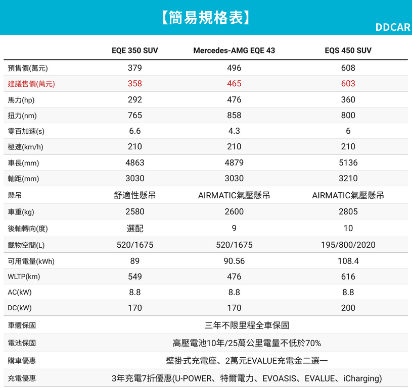 可以說是賓士今年在台最重要的電動休旅 EQE SUV 終於在昨天上市,聯袂登場的還有掛上 AMG 性能頭牌的 EQE 43,以及七人座 EQS SUV,一共三款車型正式開賣。 說重要,是因為純電豪華休旅在台灣市場需求極高,隔壁棚 BMW iX 與 Tesla Model X 都賣得嚇嚇叫,賓士缺席有點久。更重要的是,賓士已經喊出 2023 年台灣純電銷量要成長千輛,下半年就必須靠 EQE SUV 和七人座 EQS SUV 做出更多貢獻來達標。 售價方面,賓士也帶來驚喜,三款新車一上市就祭出閃降大招,建議售價都比先前的預接單價格要低,降幅介於 5 至 31 萬元。EQE SUV 起價 358 萬元,AMG EQE 43 售價 465 萬元,七座頂規 EQS SUV 則是 603 萬元。 在發表會上,我們現場做了初步開箱,快看影片一起認識 EQE SUV 為首的賓士休旅新車們: EQE SUV、EQS SUV 與 Mercedes-AMG EQE43 已經上市並陸續進駐展間,賓士此刻也推出「Mercedes-EQ 純電先鋒特展」,2023 年 7/7 ~ 7/23 在信義區 Bellavita 寶麗廣場 1F 中庭正式展開,這次介紹的三台新車統統有,對它們有興趣的朋友歡迎親至現場感受一下。 【推薦閱讀】 賓士純電休旅 EQS SUV、EQE SUV 上市,「純電先鋒特展」同步開展 賓士暢行 APP 升級整合五大充電站業者:導航付款更便利,購車再享充電七折優惠