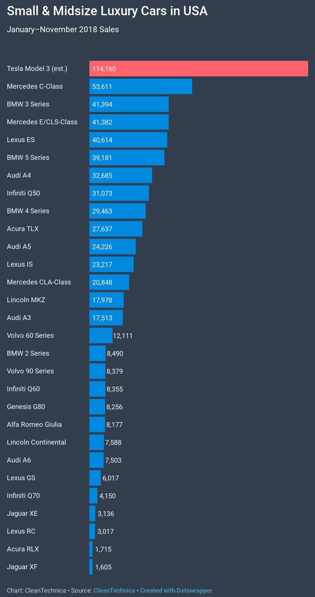 偉大卻渺小,可能是眾老牌車廠在美國車市的寫照。 根據美國最新 11 月份汽車銷售統計,超級新星 Tesla Model 3 碾壓了包括 Benz、Lexus、BMW、AUDI 與 Infinity 在內的所有知名車款,最終以 11 萬 4 千多輛的絕佳成績,拿下美國中小型豪華房車 (small and mid size luxury car) 單月銷售第一寶座。 排名第二位的,銷量甚至不及 Model 3 一半,有看到 Model 3 車尾燈嗎? Tesla Model 3 在 2018 下半年產能增進後,交車數量隨即井噴成長,不僅在中小型豪華房車稱冠,即使範圍擴大到至一般房車市場,整體銷量也有第六名的成績。一般預料,在美國電動車補助面臨取消的議題加溫下,Model 3 可望在 12 月再激發一波銷售熱潮,成為全美 2018 年度十大熱銷車款。